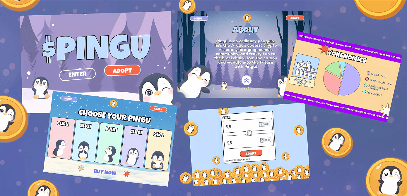 A playful and animated landing page concept for $PINGU, a meme token that blends fun visuals with NFT utility and blockchain storytelling.