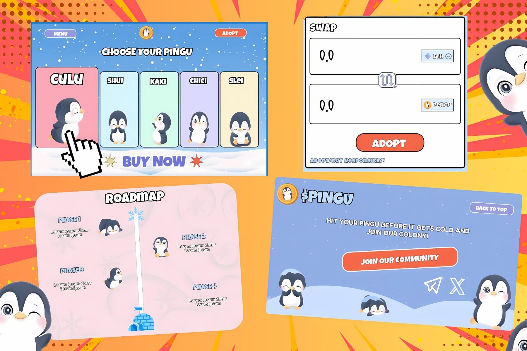 $PINGU creates a playful penguin paradise where Web3 feels like a game. Users can adopt quirky penguins, explore tokenomics presented as fun resources, follow a roadmap styled as an icy expedition, and mint NFTs in a lively hatchery. Every interaction feels like joining a penguin family, turning community building into a cute, story-driven experience.