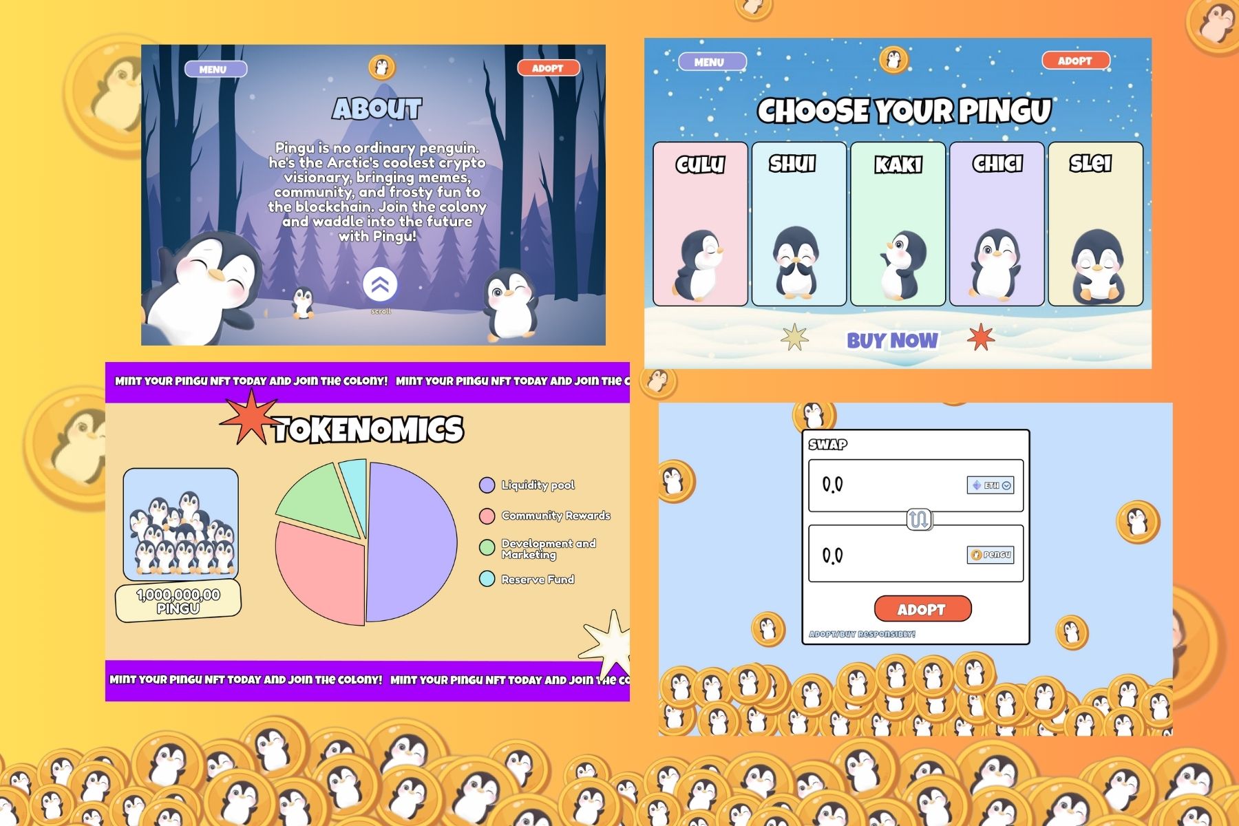 This layout introduces $PINGU's quirky ecosystem with adoptable penguins, tokenomics, roadmap, and an NFT minting section. Designed to spark curiosity and drive community interaction for early-stage Web3 audiences.