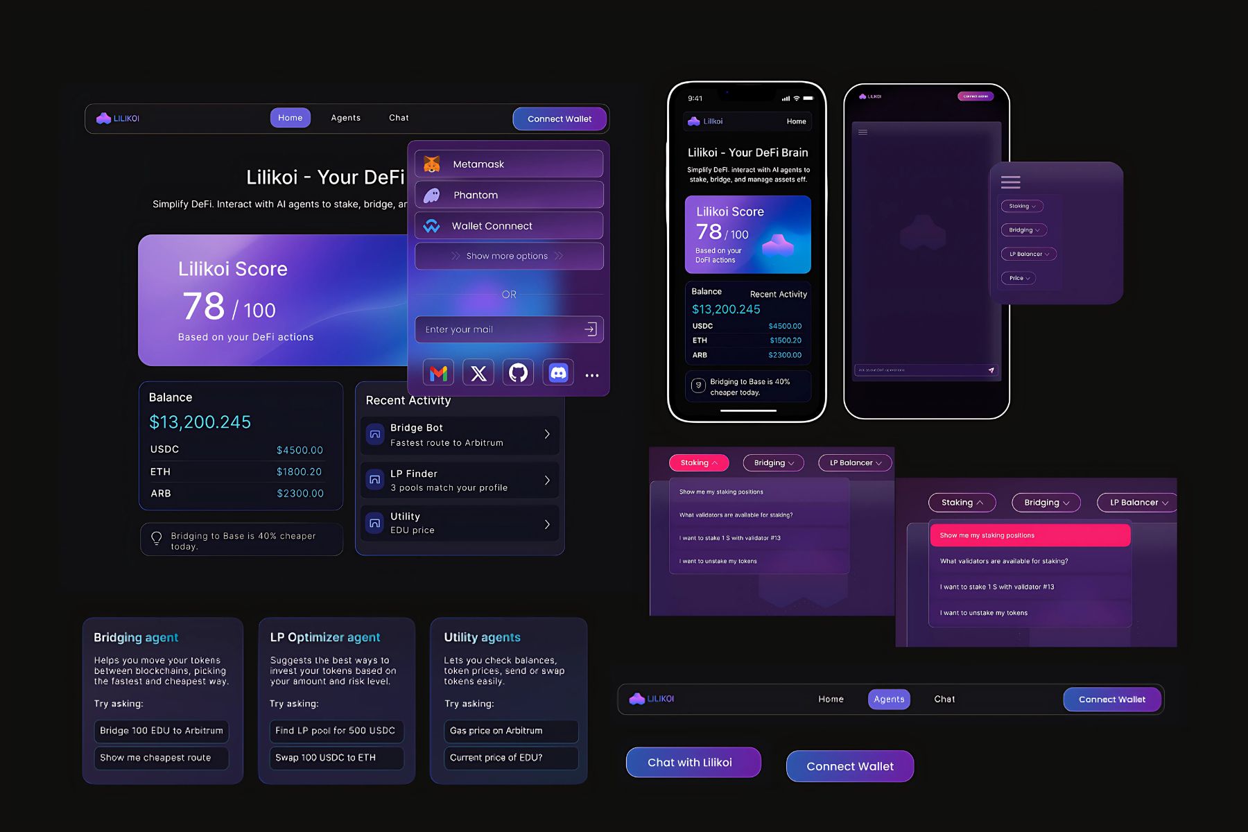 We crafted a responsive design that reflects the intelligence and automation behind Lilikoi. The interface is clean yet rich, with a clear hierarchy and effortless wallet integration. A modern layout supports quick scanning of balances, Lilikoi Score, and recent AI actions.