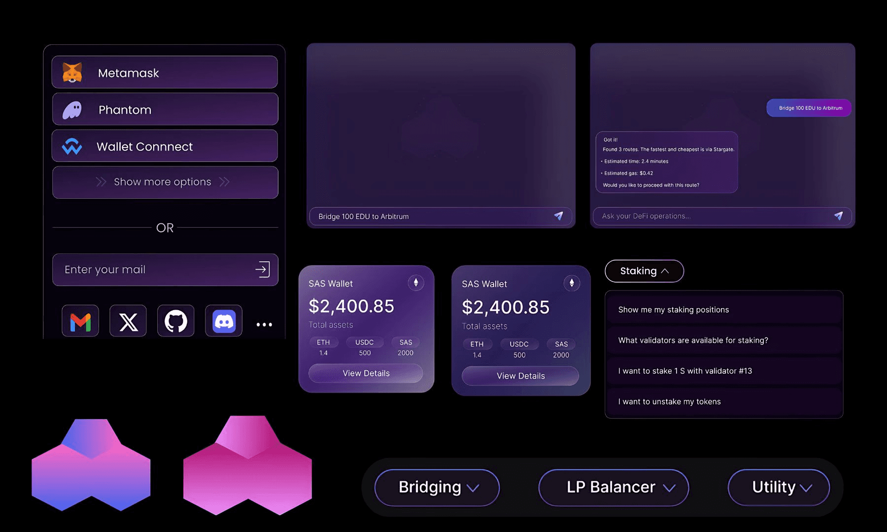 The interface was crafted with a strong focus on simplicity, clarity, and user ease. We used a modern glassmorphic style combined with a vibrant pink-purple palette to create a sleek, futuristic look. Typography is set in Inter, chosen for its legibility and clean tone. The layout avoids complexity, making wallet access, staking info, and user actions easy to navigate. A custom logo was also designed to reflect the intelligence and automation at the core of the product.