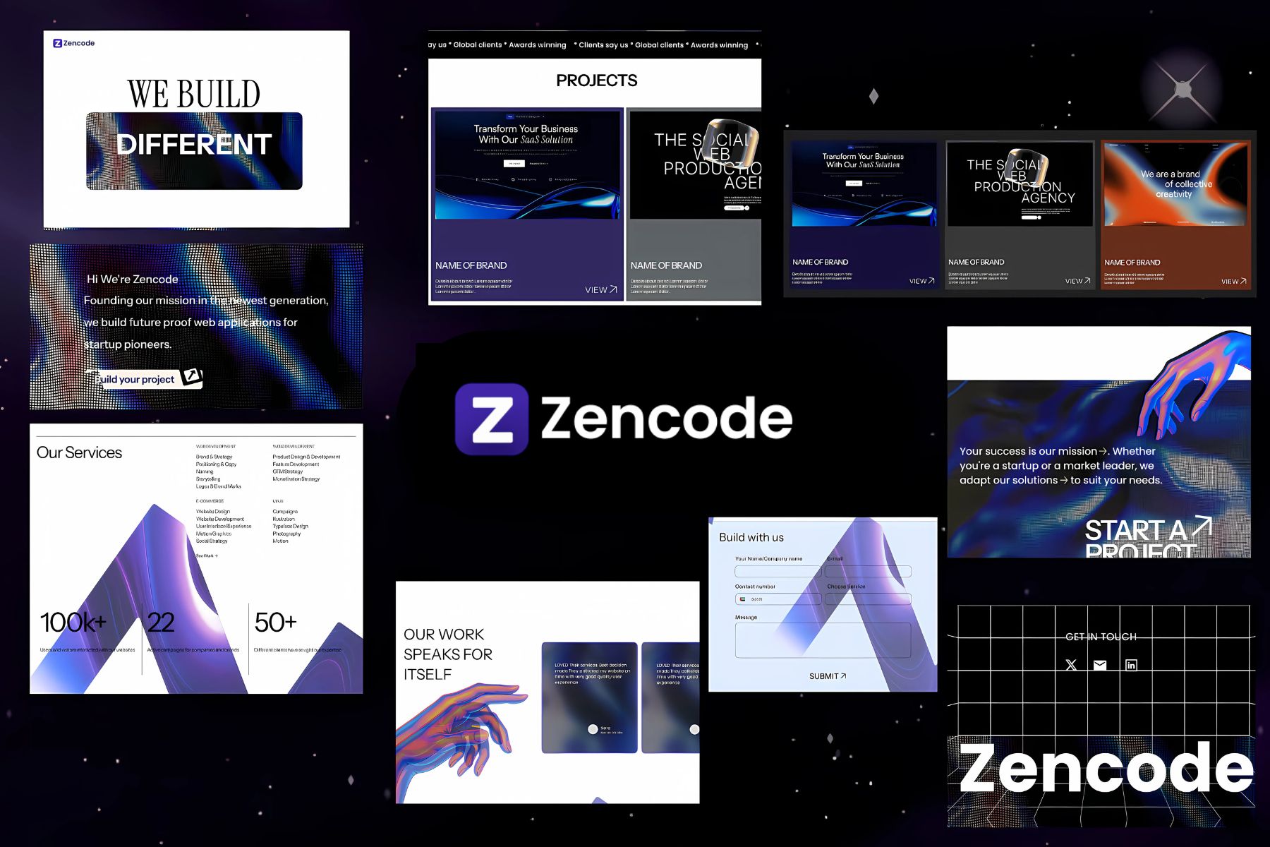 A dual-theme visual language: the dark theme channels a glitchy, cybercore aesthetic using iridescent textures and neon hues, while the light theme brings clarity and balance. Hand-illustrated 3D hands, glitch overlays, and grid systems give a surreal, kinetic vibe perfectly aligning with Zencode’s “We Build Different” mantra.