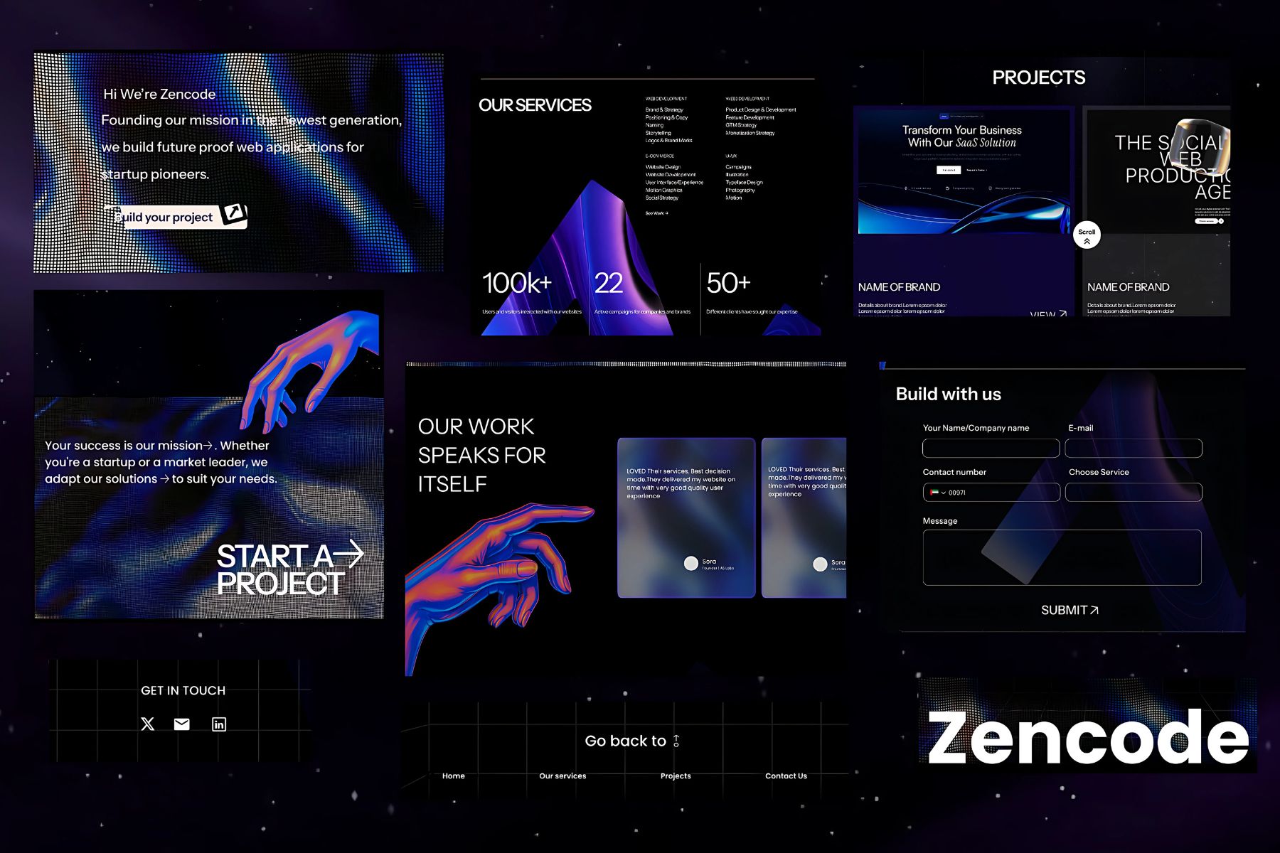 To position Zencode as a design-forward, builder-centric agency for Web3 startups merging experimental design with robust technical services in a visually immersive, future-facing interface.