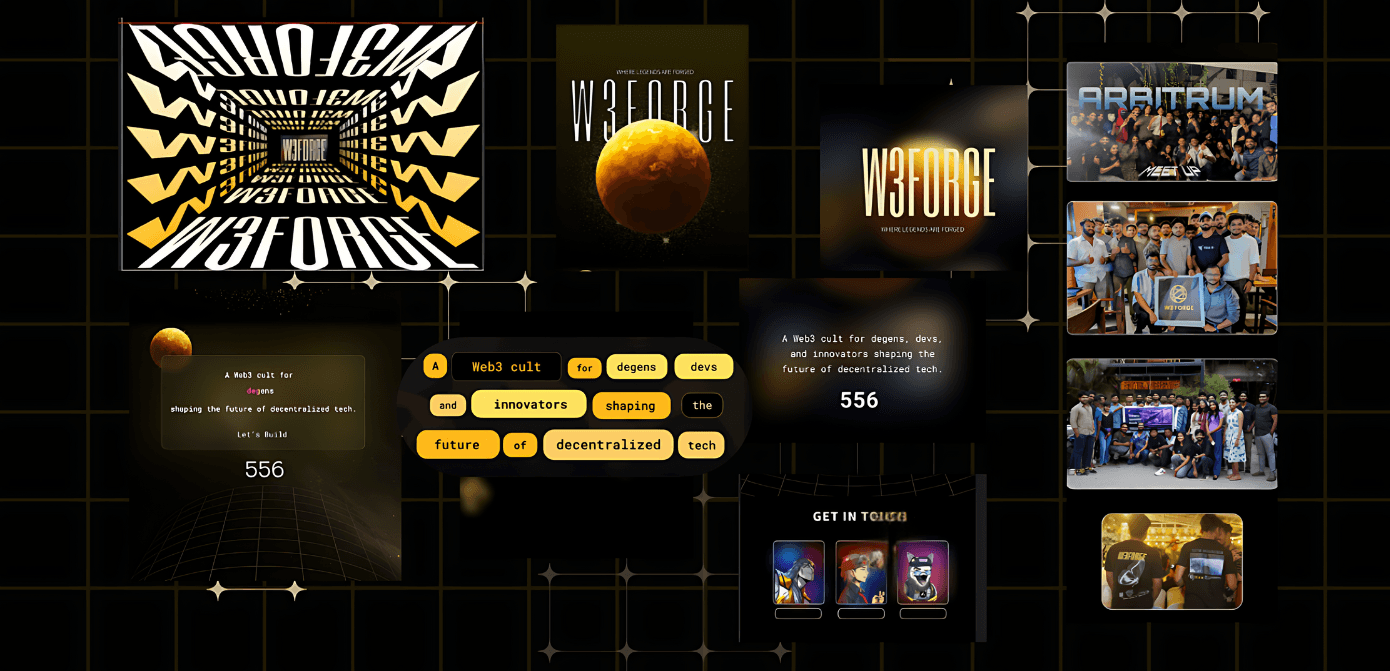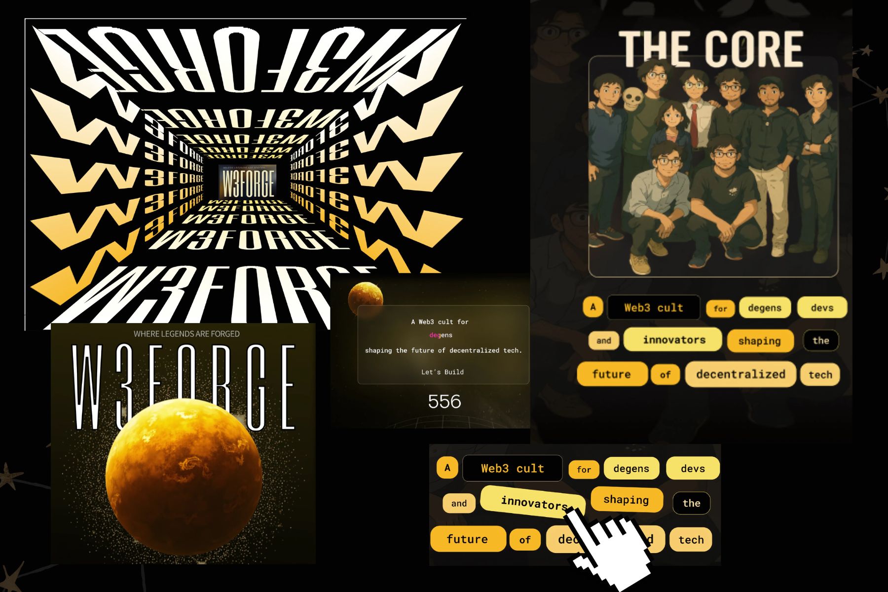 Designed to reflect W3FORGE’s raw, cult-like identity, this layout emphasizes mystery, energy, and underground Web3 culture. The structure supports dynamic content, event drops, and showcases of creative momentum.